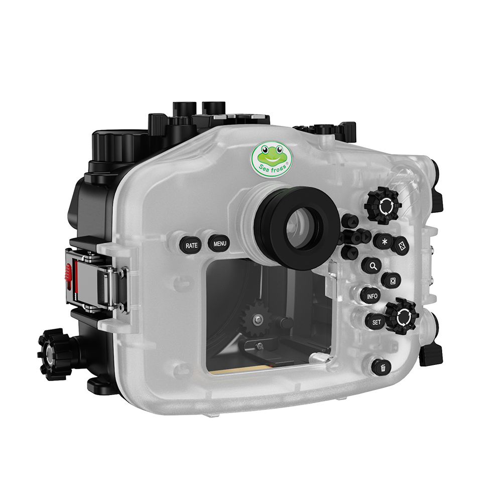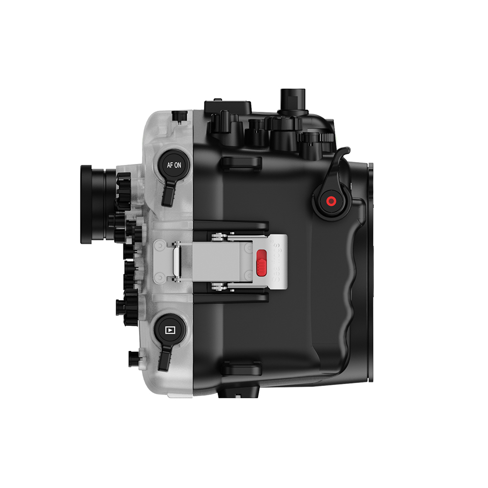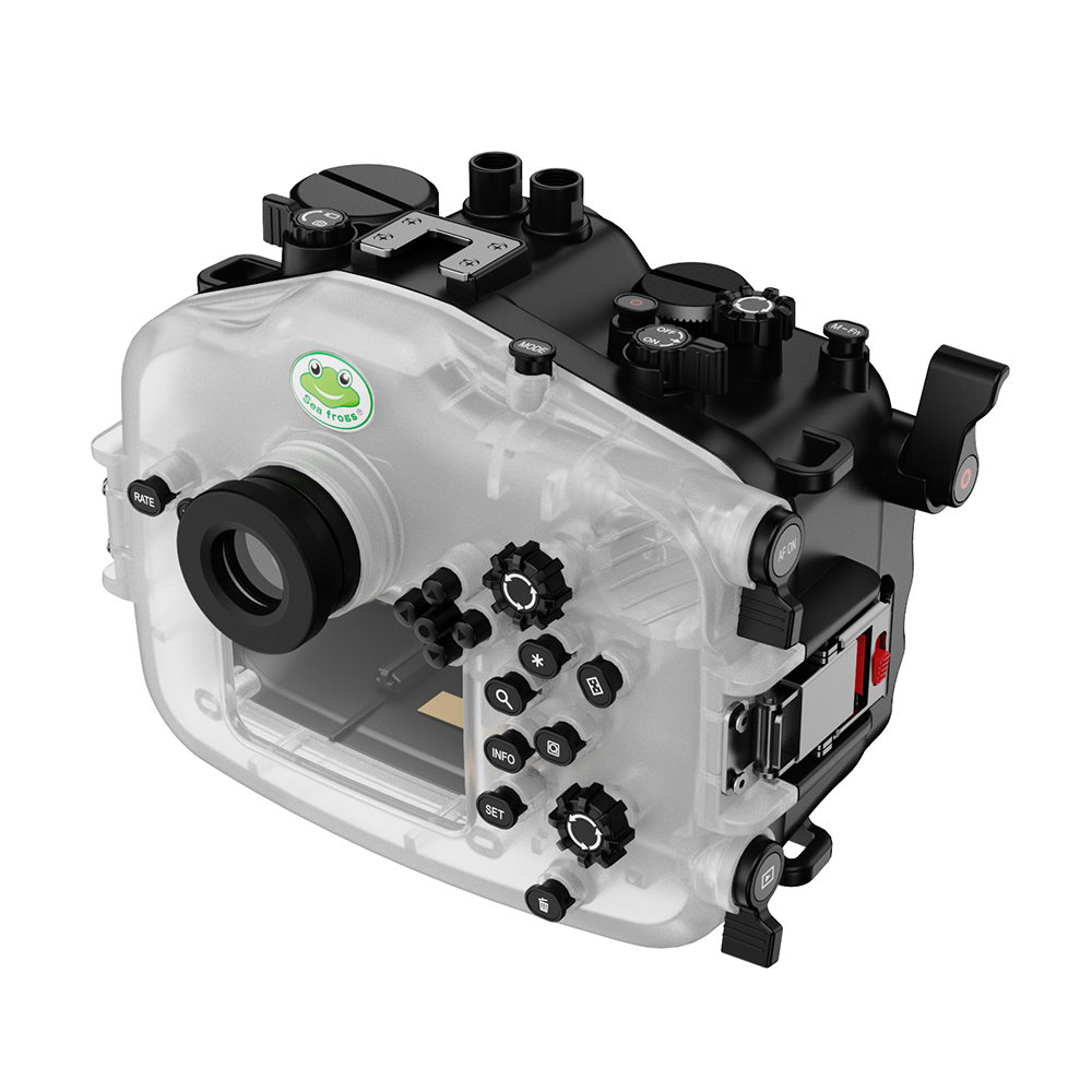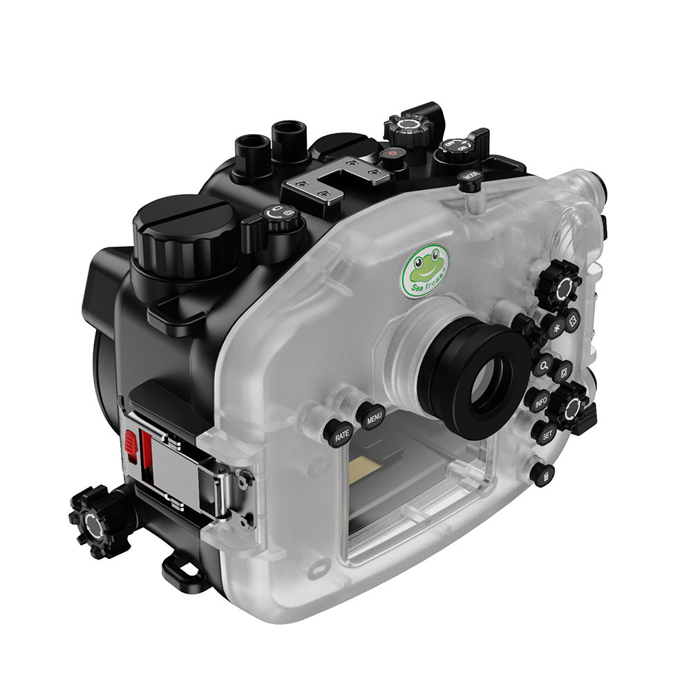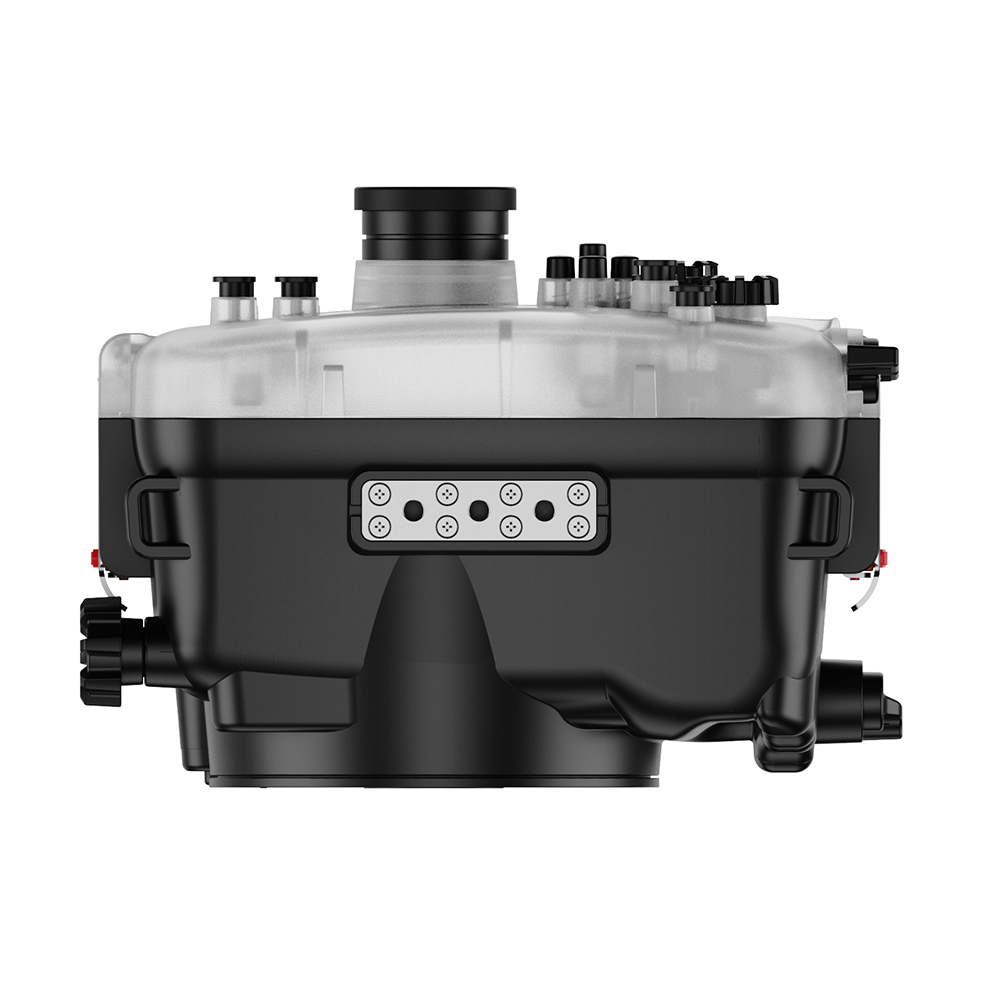 Подводный бокс Sea Frogs для Canon EOS R5 II сделан из прочного поликарбоната. Байонет под сменные порты для объективов Type-1. Глубина погружения 40 метров. Подключение внешних вспышек через оптоволоконный кабель или электрический разъем. Контроль зума или ручной фокусировки. Имеет датчик протечки со звуковым и световым сигналом. На боксе также установлен оптический видоискатель. Удобная кнопка спуска затвора типа "курок". Вакуумный порт для проверки бокса на герметичность. Надежность бокса обеспечивают два металлических замка с предохранителями и два о-ринга на крышке и корпусе бокса. Также бокс имеет крепление типа "холодный" башмак и снизу два штативных гнезда.
